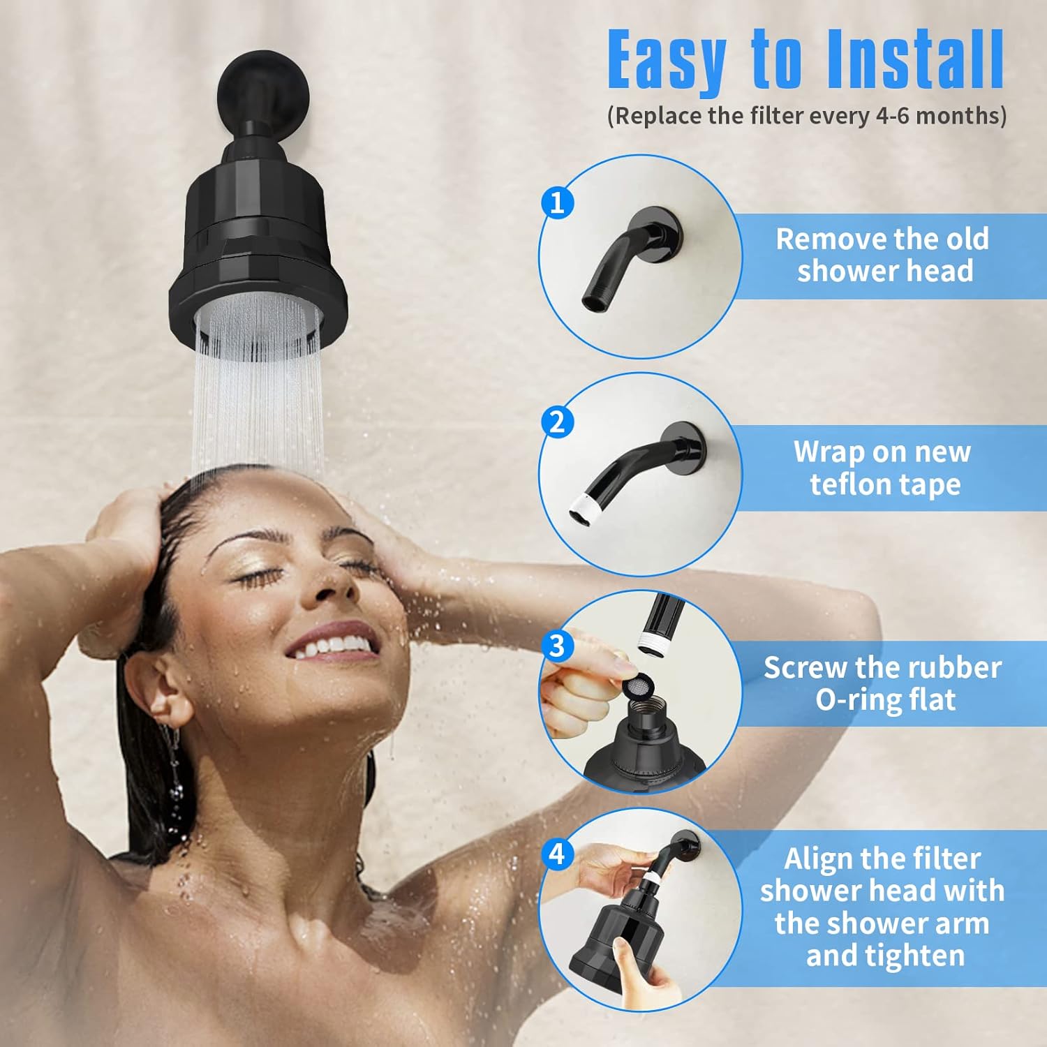 15-vaiheinen suodatussuihkupää on suunniteltu helpoksi asentaa. Yleensä voit ruuvata sen olemassa olevaan suihkuvarteen ilman erikoistyökaluja. Katso aina yksityiskohtaiset asennusvaiheet mukana toimitetusta käyttöoppaasta.